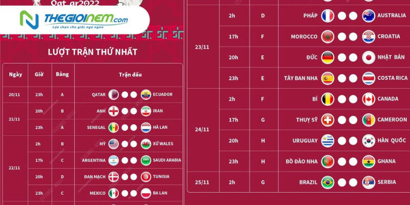 - Ngày 22/11 : Đan Mạch - Tunisia vào lúc 20h00