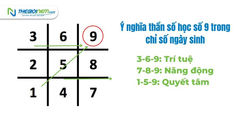 Thần số học trong ngày sinh theo trường phái Pitago được chia thành bảng 3 cột dọc, có 3 cột ngang và tạo thành 2 đường chéo với những ý nghĩa khác nhau. Theo đó, ý nghĩa thần số học của số 9 trong chỉ số ngày sinh sẽ tương ứng như sau: