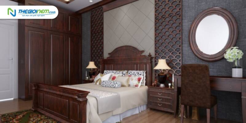 Phòng ngủ được thiết kế với phong cách cổ điển và tập trung vào sử dụng màu sắc. Nội thất được chế tác từ chất liệu gỗ tự nhiên màu nâu đen, tạo nên sự đẹp mắt và bền bỉ trong thời gian sử dụng. Sự pha trộn hài hòa giữa các gam màu như nâu, xám, trắng và kem mang lại cho phòng ngủ cảm giác sang trọng mà vẫn ấm cúng.