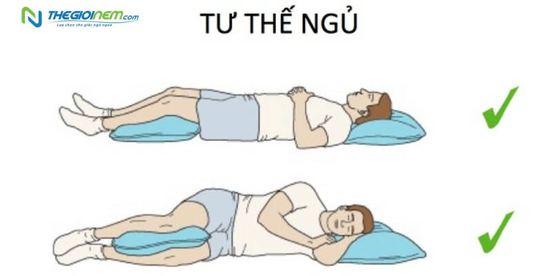 Chọn tư thế ngủ mà cơ thể bạn cảm thấy thoải mái nhất. Thường thì nằm ngửa hoặc nằm nghiêng sẽ giảm áp lực lên cột sống hơn là nằm ngửa. Đặt một chiếc gối dưới đầu để giữ cho cổ và đầu bạn nằm thẳng và hỗ trợ cột sống. Nếu bạn thường ngủ nghiêng, hãy đảm bảo có đủ gối để giữ cho cơ thể bạn thẳng và cân bằng.